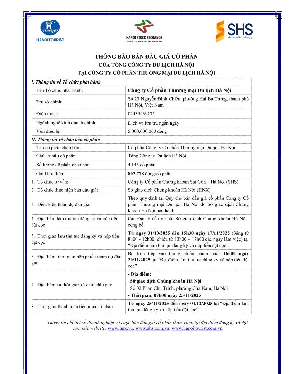 Chào bán đấu giá công khai Cổ phần của Tổng công ty Du lịch Hà Nội sở hữu tại Công ty Cổ phần Thương mại Du lịch Hà Nội