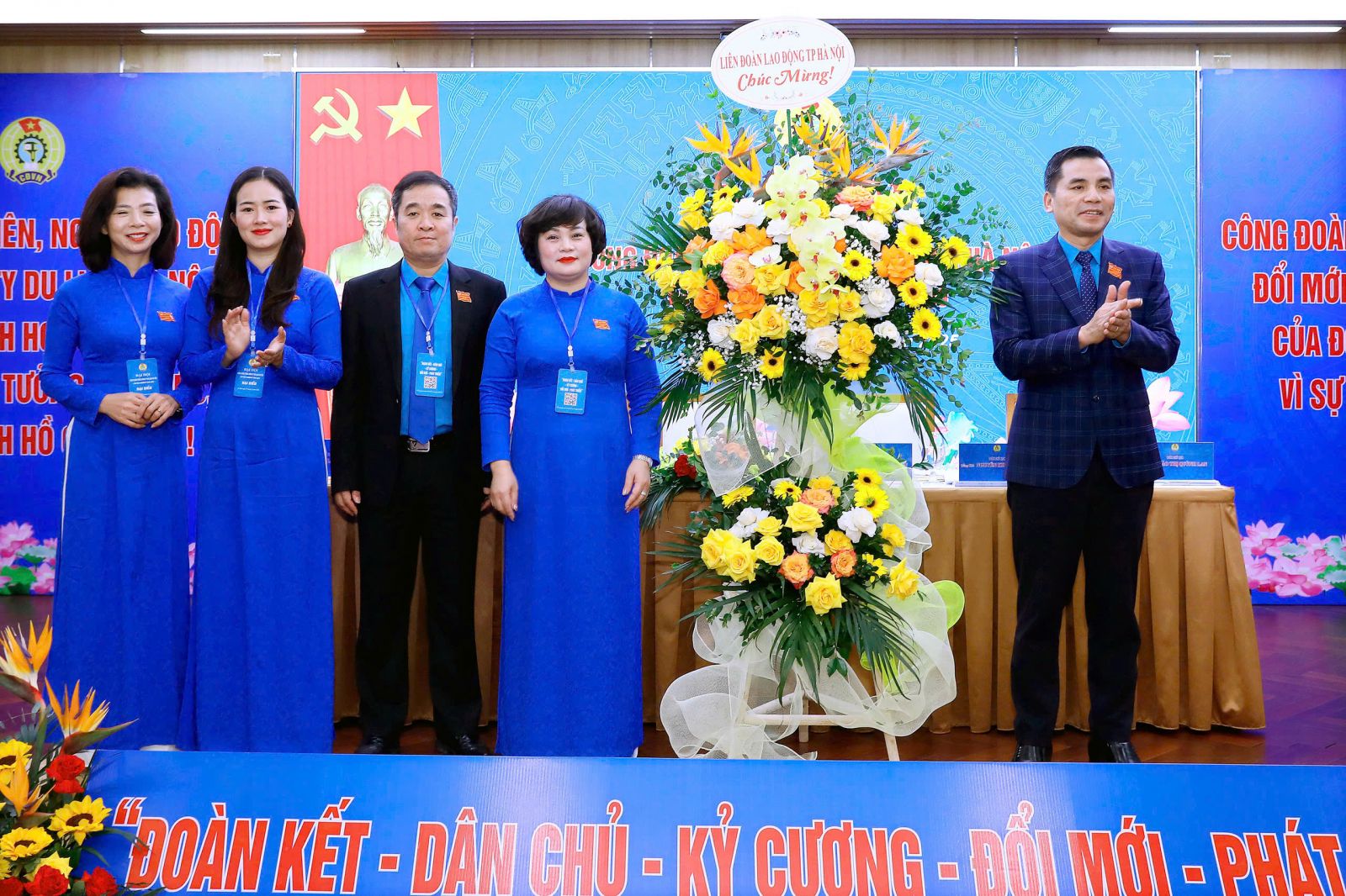 Đồng chí Lê Đình Hùng (Bên phải), Phó Chủ tịch Thường trực LĐLĐ thành phố Hà Nội tặng lẵng hoa chúc mừng Đại hội