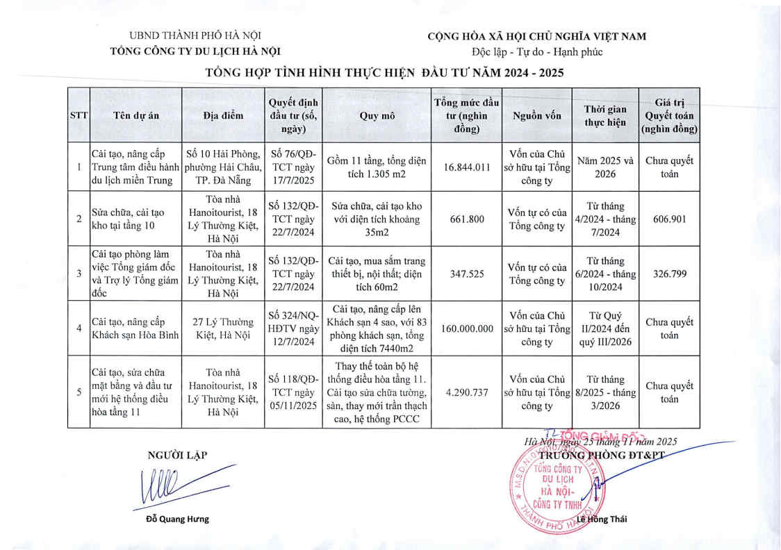 Tổng công ty Du lịch Hà Nội trân trọng công bố thông tin tình hình đầu tư năm 2024-2025.