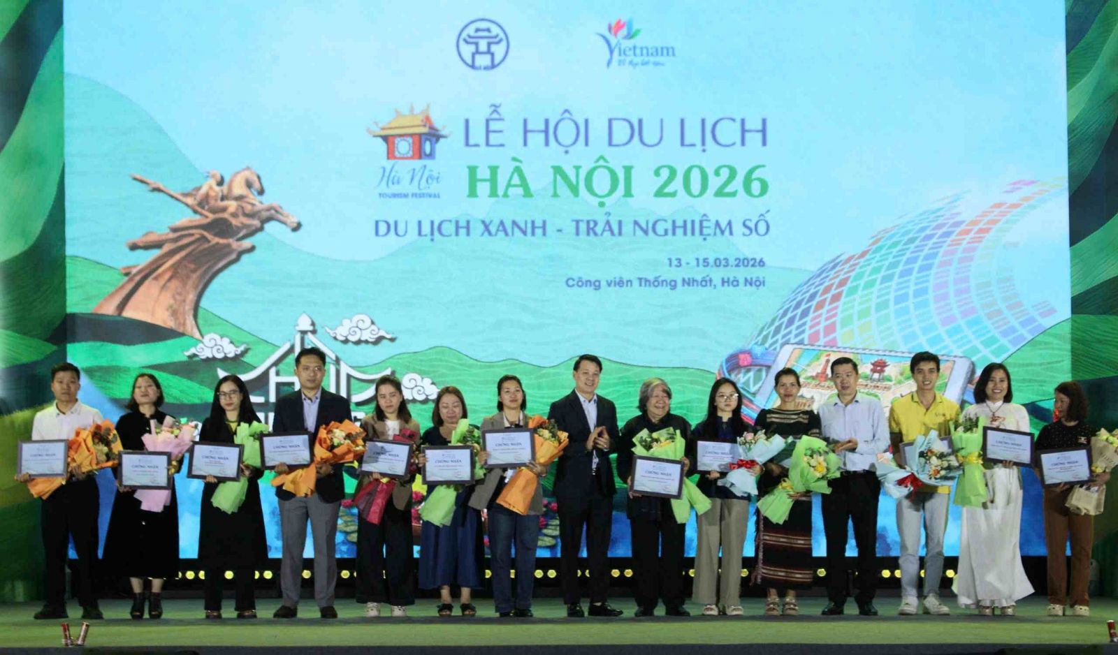 Phó Giám đốc Sở Du lịch Hà Nội Nguyễn Trần Quang trao chứng nhận cho các đơn vị tham gia Lễ hội Du lịch Hà Nội 2026