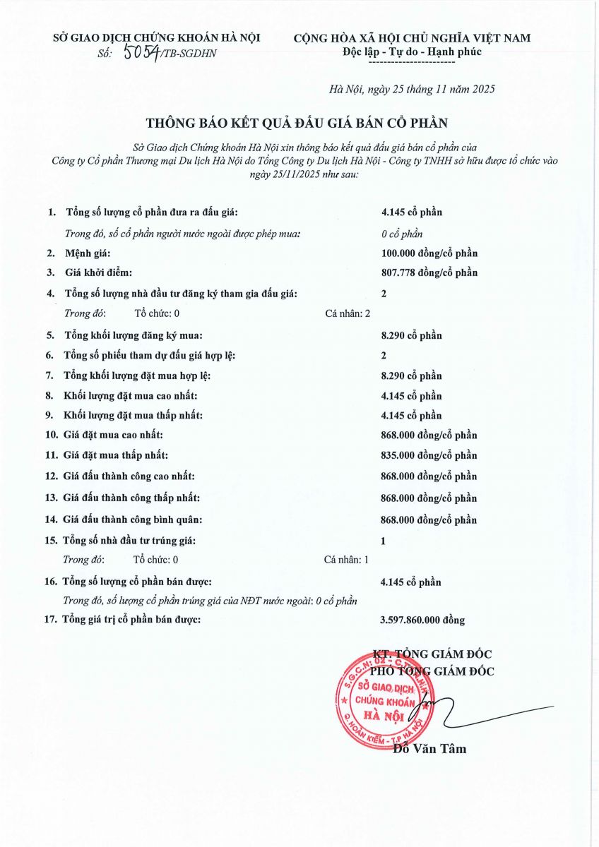 Thông báo kết quả đấu giá bán 4.145 cổ phần của Công ty CP Thương mại Du lịch Hà Nội do Tổng công ty Du lịch Hà Nội sở hữu